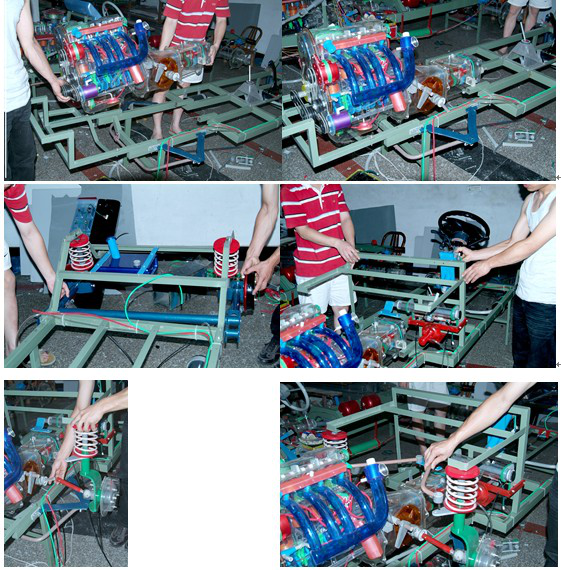 (8)制動(dòng)管路:制動(dòng)管路在車架上基本沒有拆下,只需在連接處小心對(duì)準(zhǔn)連接。冷卻管路是用節(jié)紋軟朔管套接的。油箱到汽油泵、到濾清器的管路都用塑料套管套接。到些安裝完畢。