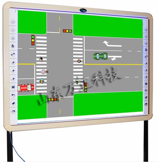 2、教練員與學員間的互動性強。教學過程中,教練員配置好交通場景后,可以針對該場景設置各種問題,和學員共同探討正確的駕駛行為方式,并通過交通元素位置的靈活變化,模擬出各種交通行為的后果,增強學員對知識的理解能力和知識的應用能力,提高學員學習的主動性,克服“灌輸式”教學導致的枯燥感。 如圖所示,教練員在教學過程中,可以向學員提出以下問題:圖片上方左轉彎車輛與直行車輛誰具有優(yōu)先通行權?圖片下方右轉彎的車輛應該采取怎樣的駕駛行為方式?存在哪些交通沖突? 3、教學內容直觀、生動。交通場景,尤其是城市復雜的交通場景,教練員很難單純地用語言解釋清楚。因此,教練員可以借助畫面演示等直觀、逼真的方式,促進學員的理解。例如,教練員進行“彎道和曲線駕駛”教學時,可以借助教學磁板給學員分析車輛在彎道的受力情況,彎道行駛時的潛在危險和提前減速行駛的必要性等。 4、教學素材多樣。教學磁板除了能利用已有的交通元素靈活地組建各種交通場景外,還有助于教練員對教學素材的拓展,即能夠保存教練員自行收集的教學背景圖片,以增強教學磁板的地區(qū)適應和教學的靈活性。5、操作簡便。教學磁板的界面整潔,教練員操作時,更多的是采用點擊或拖拽圖標的方式,針對相對難以理解的功能右詳盡的操作執(zhí)導,因此,能否很好地利用教學磁板來組織教學,關鍵在于教練員對駕駛培訓專業(yè)知識的掌握程度,在于教練員組織的教學場景與教學內容更加專業(yè)和貼近實際,而在電腦技術方面對教練員沒有特殊的要求。