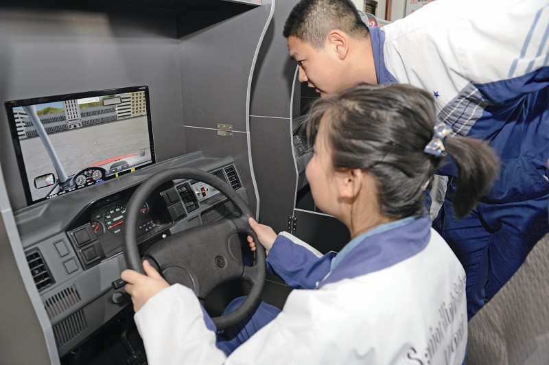 記者看到,教室里擺放了數(shù)十臺(tái)山東萬(wàn)正汽車(chē)駕駛模擬器,其設(shè)置與汽車(chē)駕駛室完全相同,方向盤(pán)、擋位器、踏板等樣樣齊全。